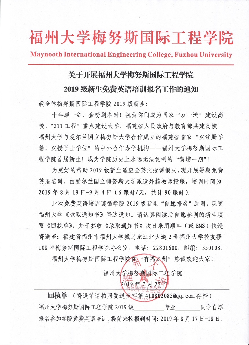 为帮助大家适应全英文授课模式,现做爱影片 决定开展免费英语培训,时间为2019年8月19日-9月4日(6课时/天,90课时),遵循“自愿报名”原则。大家收到的做爱影片 《录取通知书》中将会随寄培训报名通知,请自愿报名新生按要求将《回执单》寄回。通知详见下图: