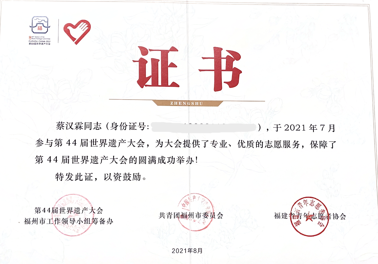 团委志愿者工作部学生副部长,投身志愿服务工作,始终把“服务校园、服务同学”作为宗旨,履行职责和使命。他曾参与第四十四届世界遗产大会,以及第四届数字中国建设峰会的志愿服务工作,并获得优秀志愿者荣誉;累计志愿服务时长已超过220小时。