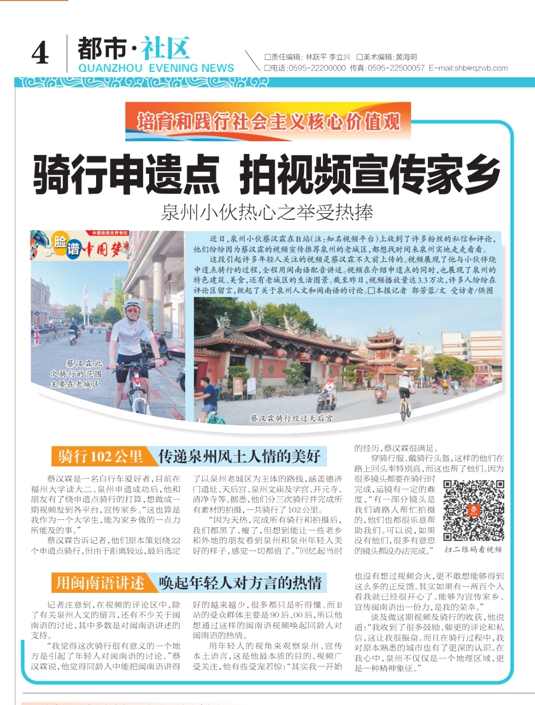他是传统文化的青年宣传者。学习之余,他在微信公众号、小红书、哔哩哔哩等网络平台积极推广闽南传统文化,展现新时代青年风采;累计拥有5000名关注者,相关视频播放量超过20万,曾获泉州晚报、青春福大等官方媒体报道。