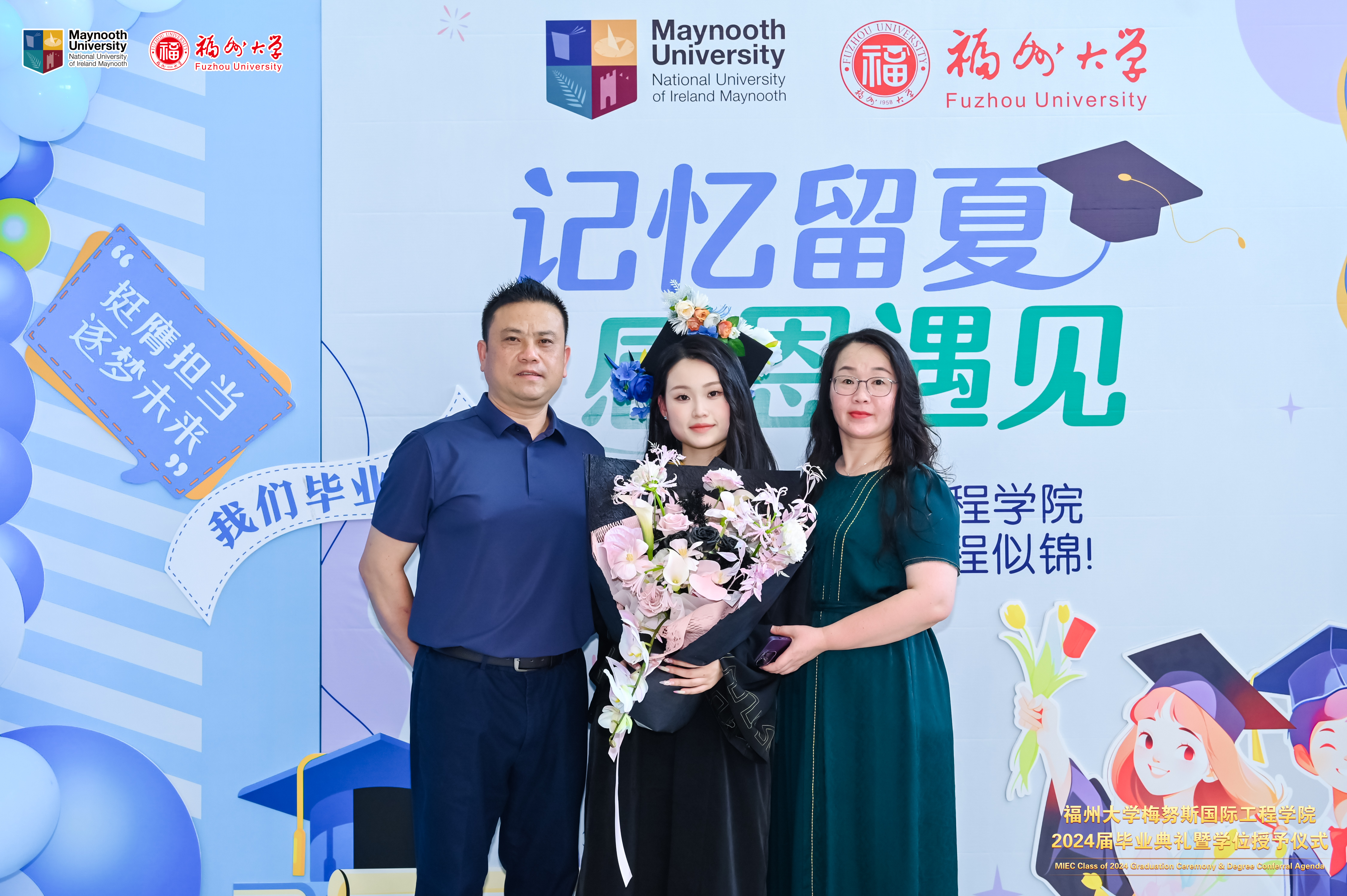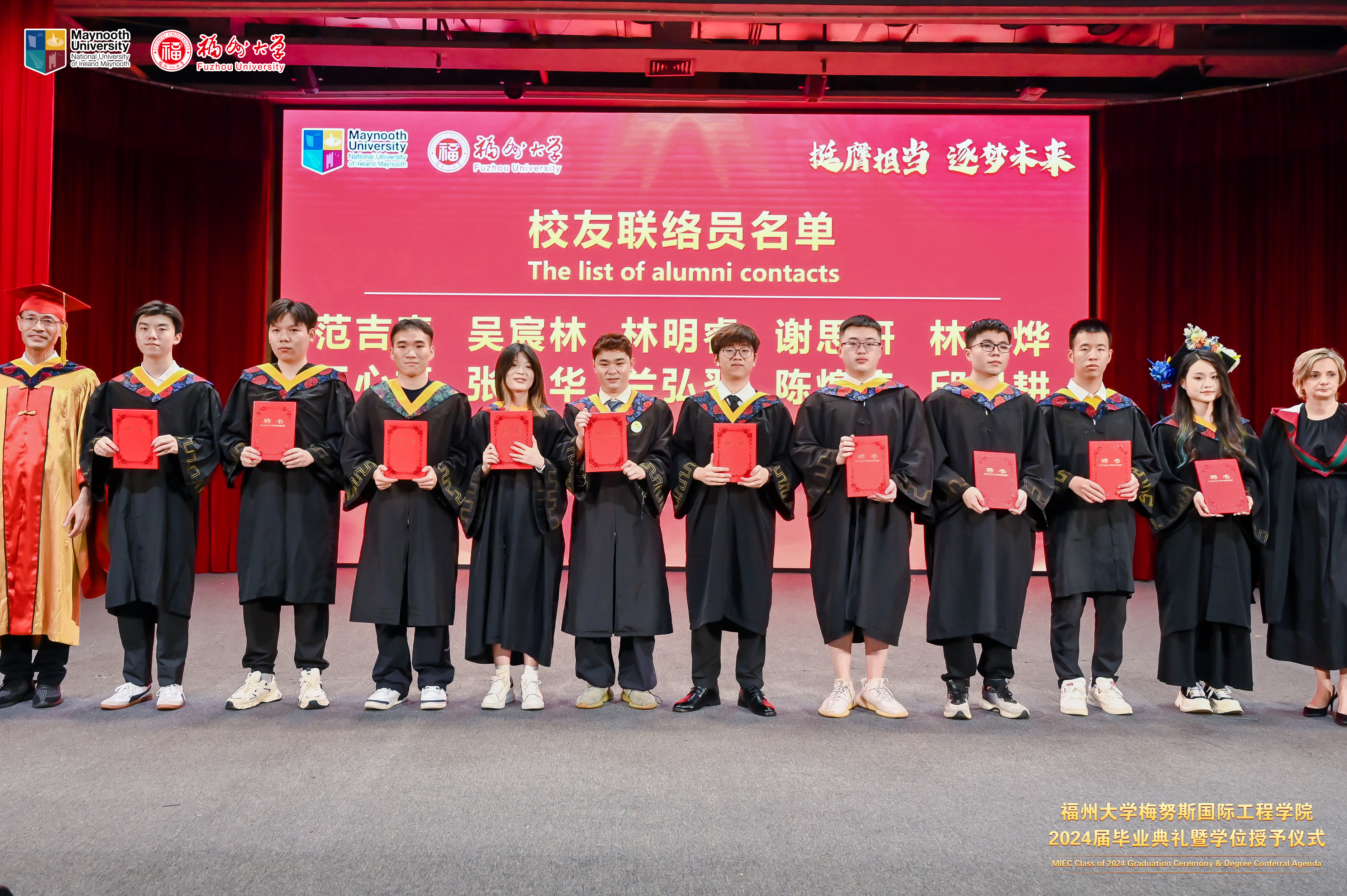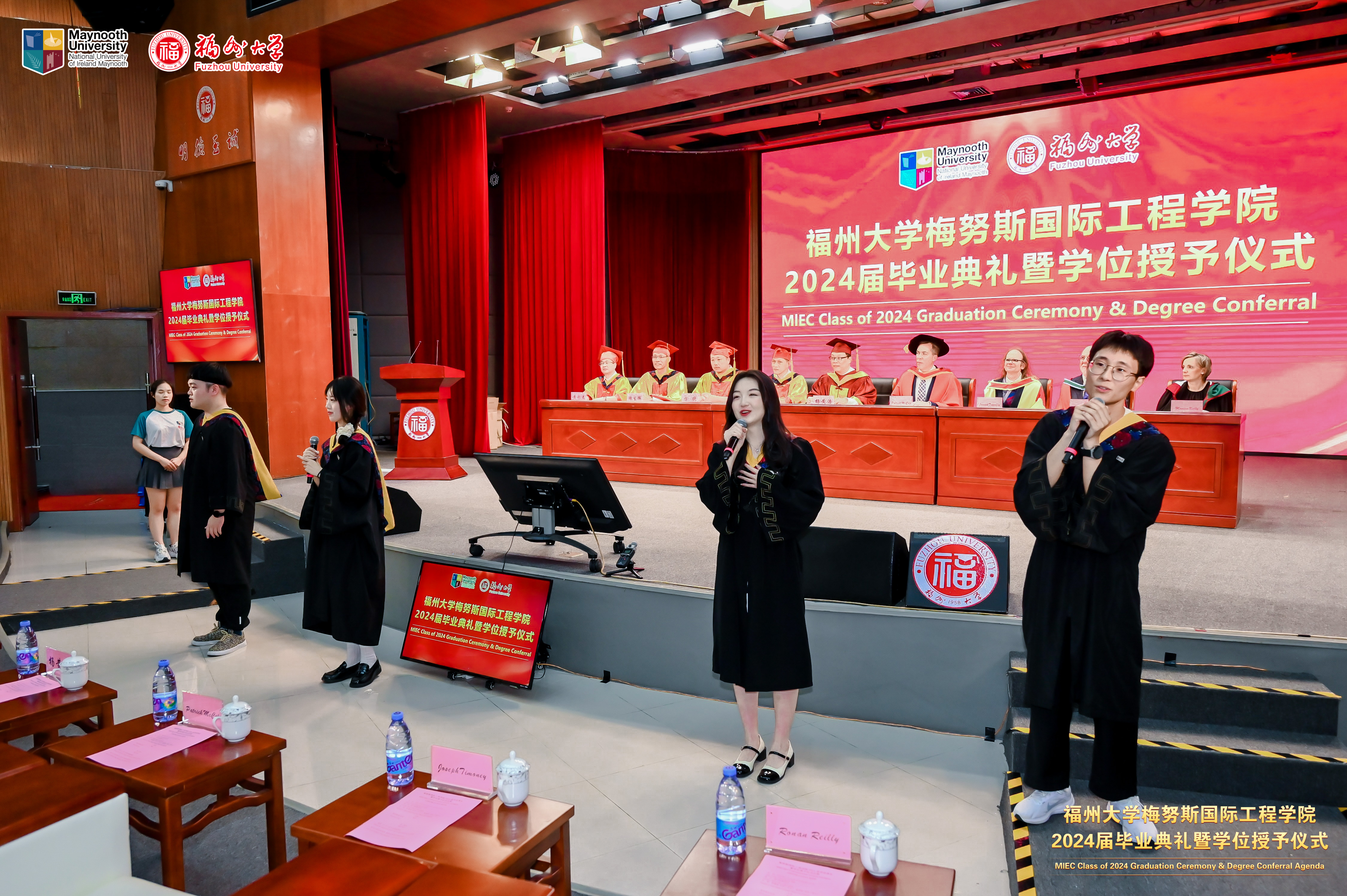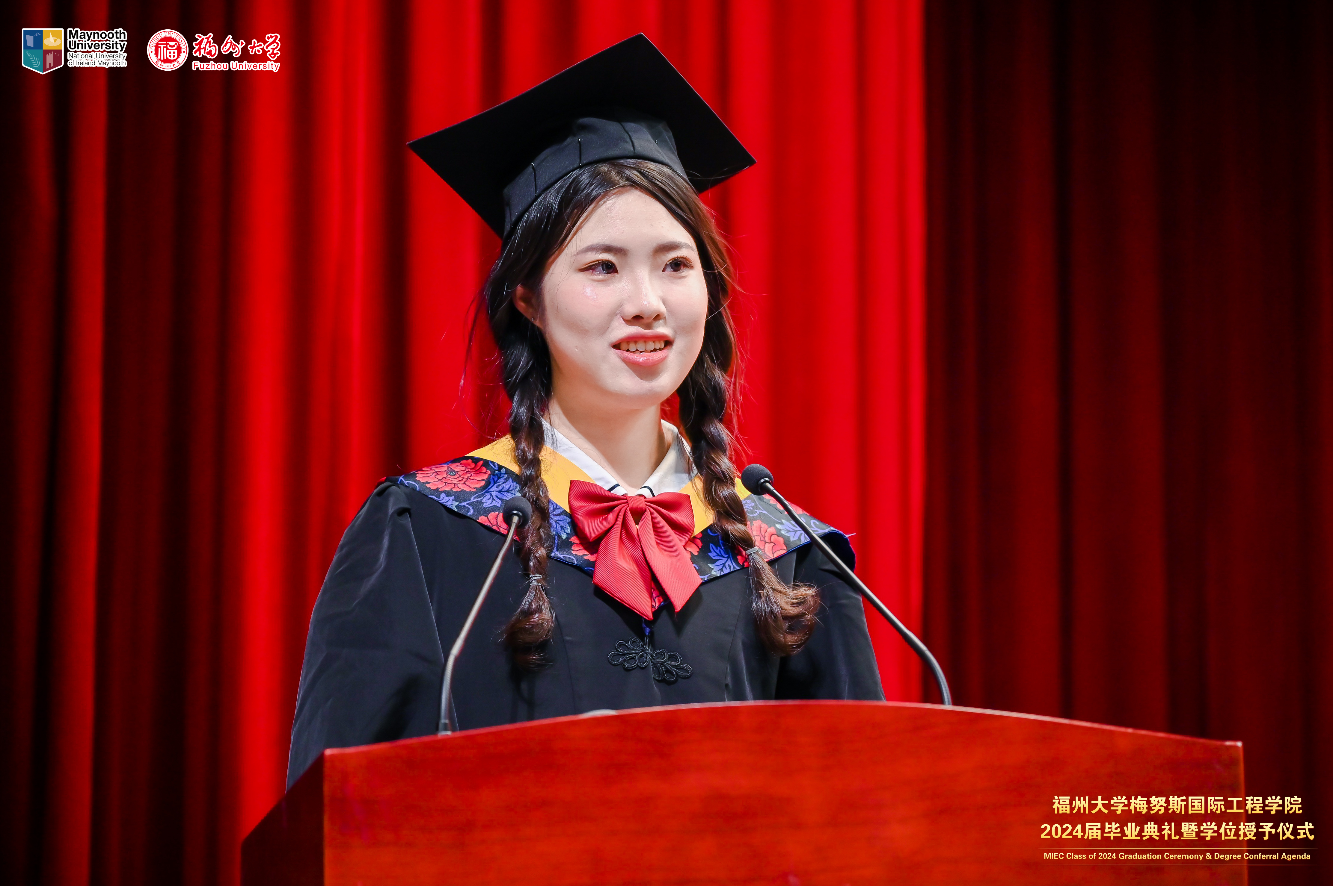 毕业生代表张伊纯同学回顾了四年来与梅努斯、与福大的欢笑与泪水。对双方院校的领导与教职工表达真挚的感谢,对并肩作战的同学们送上真挚的祝福。并与毕业生们共勉:保持永不懈怠的精神状态和一往无前的奋斗姿态,成为有理想、敢担当、能吃苦、肯奋斗的新时代梅努斯青年。