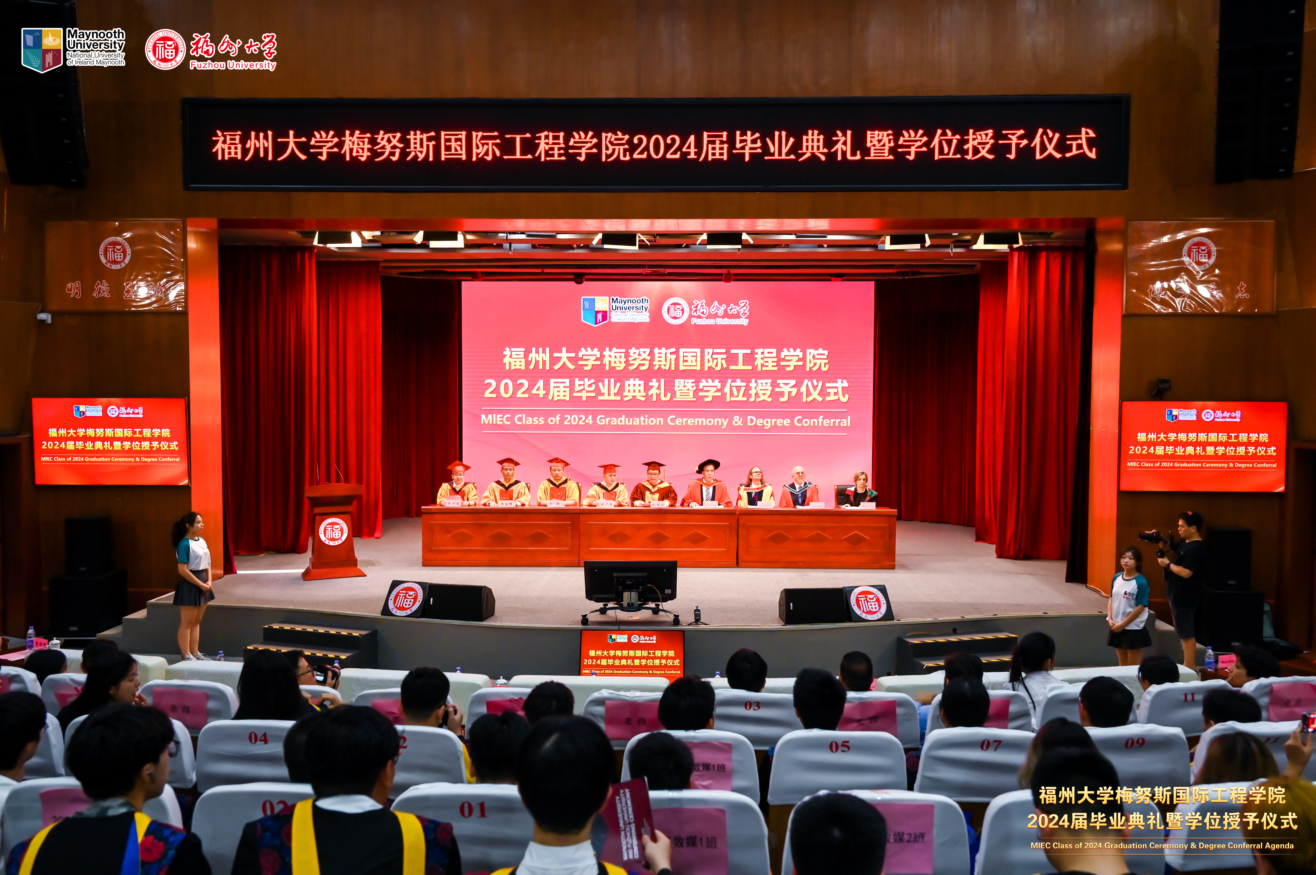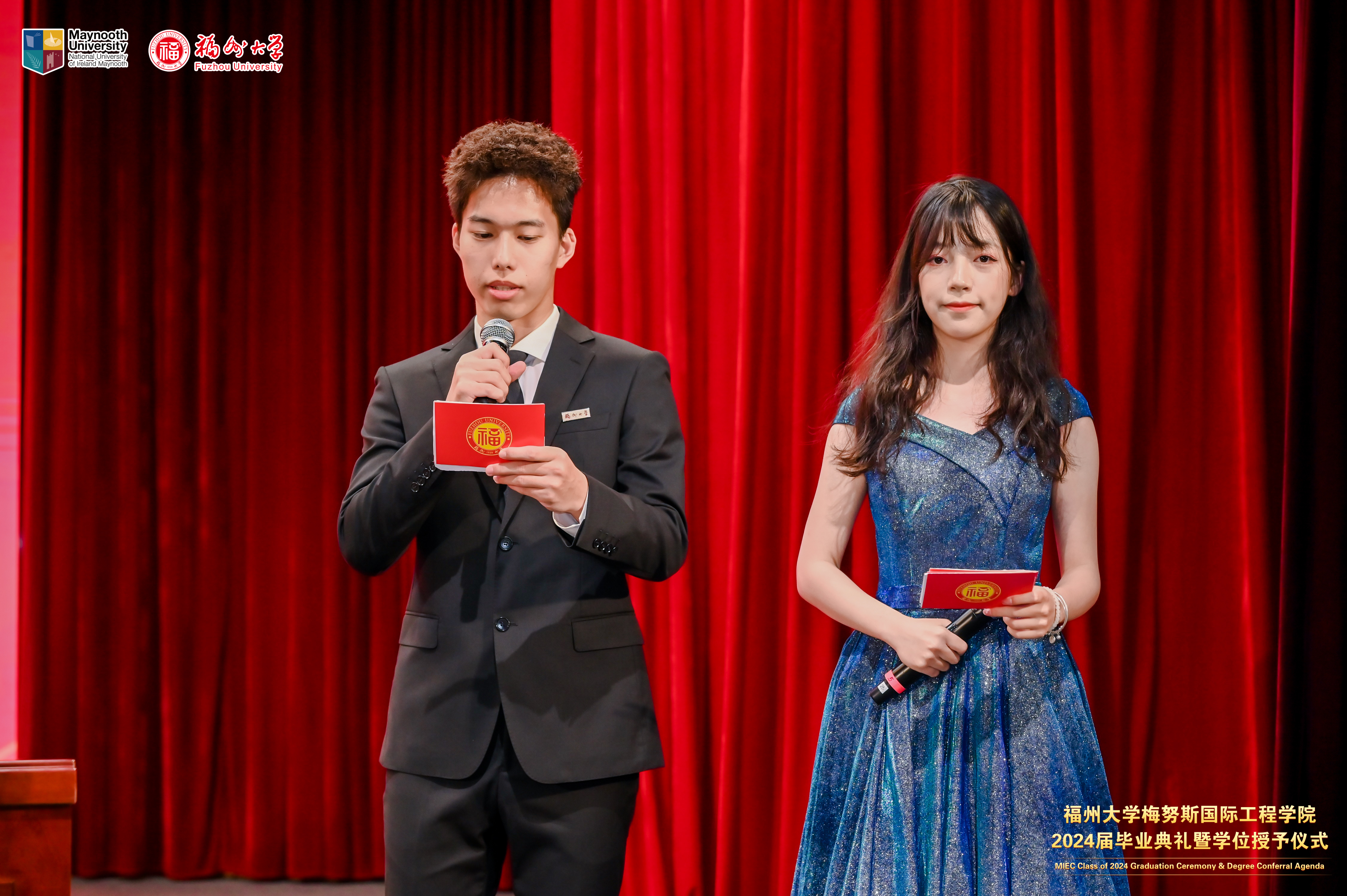 党委游生辉副书记、副院长黄彩进教授出席本次典礼。此外,梅努斯大学副校长Patrick McCole 教授率梅努斯大学代表团,不远万里专程出席本次典礼。参加典礼的还有中外方教师、家长代表和全体2024届毕业生。典礼由学生代表张梓浩和郭潇逸双语主持。